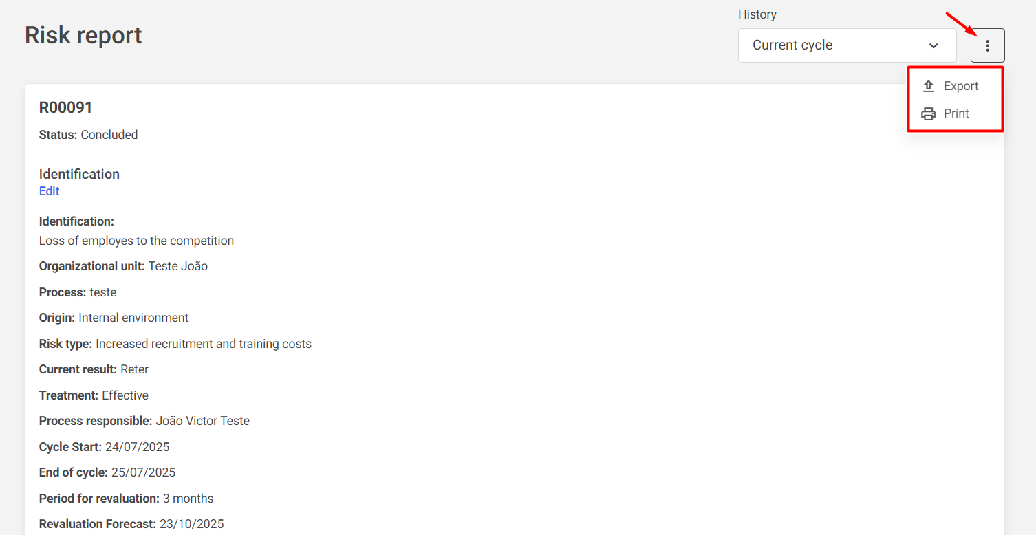 Next to the history, by clicking the three-dot icon, it will be possible to print or export the risk report.