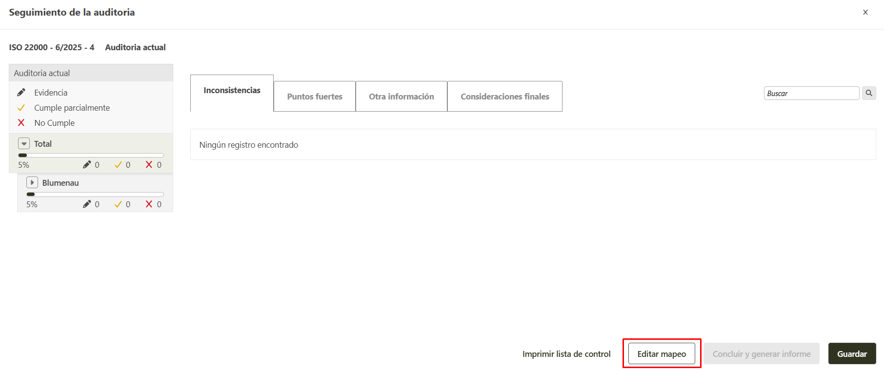 Solamente el usuario que registró la auditoria o el auditor líder pueden editar el mapeo . Puede ver esa información en la ventana de detalles del informe de la auditoria, en los campos Registrado por y Auditor-líder.