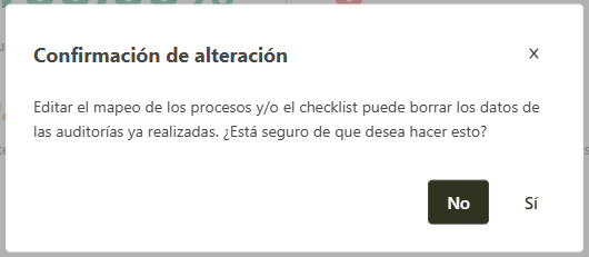 Independientemente de la opción que utilice para editar el mapeo, el sistema mostrará un mensaje de alerta, el cual explica que editando el mapeo de los procesos y/o lista de control, todos los datos ya auditados pueden ser perdidos, en caso de que ya haya realizado alguna auditoria de dicho programa. Hacer clic en Si para continuar con la edición, de lo contrario hacer clic en No.