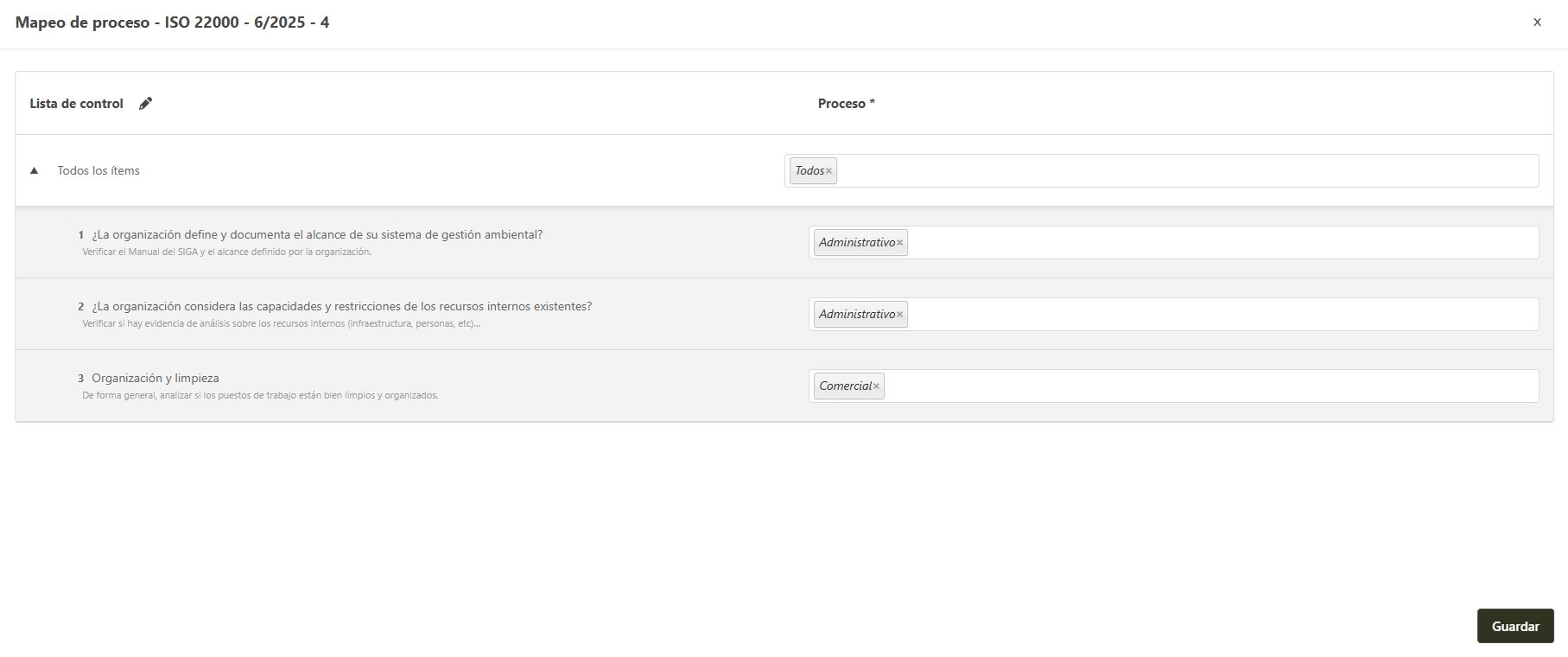 El responsable por la edición puede determinar cuales ítem serán auditados en que procesos, o definir todos los ítem para todos los procesos.