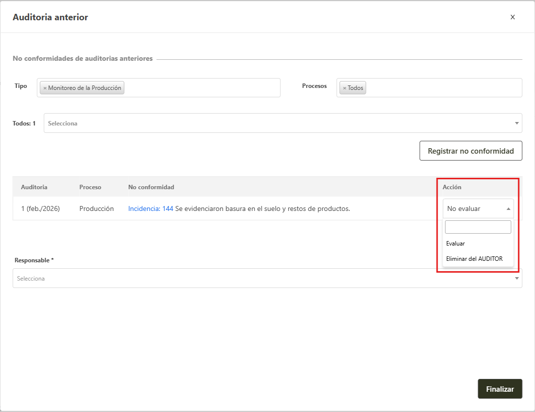 • Evaluar: al seleccionar esta opción, antes del cierre de la auditoria, será necesario realizar las tratativas de la misma.