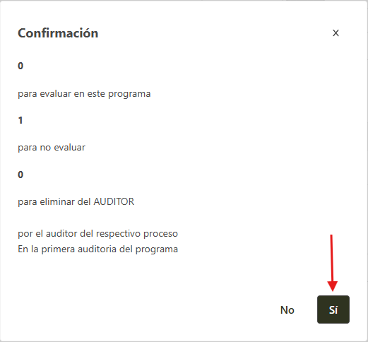 Esta opción sirve para informar cuales fueron las no conformidades encontradas en la auditoria anterior y decidir si las mismas serán evaluadas en la auditoria actual o no. El pendiente será generada tanto para quién registró el programa de auditoria como para el auditor líder.