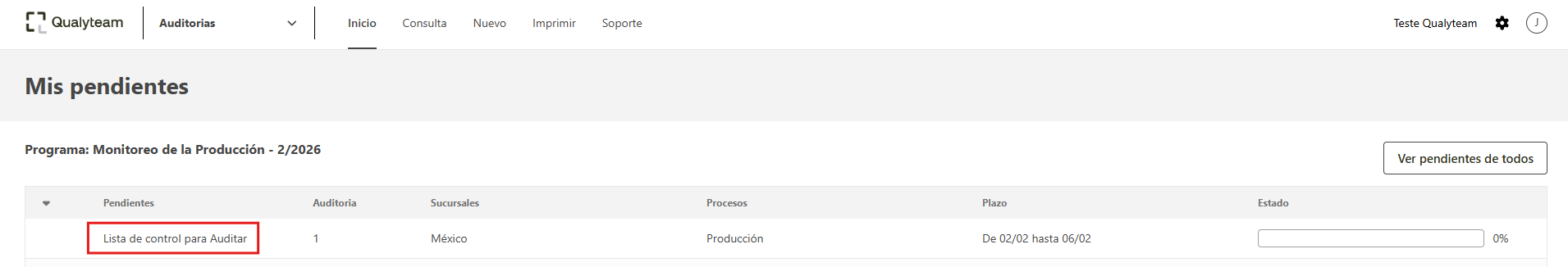 Así que la planificación de la auditoria sea finalizada, el sistema notifica al responsable por la auditoria y genera el pendiente para completar la lista de control. El pendiente estará localizado en la ventana de inicio del auditor del proceso definido en la etapa de detalles de los equipos e actividades.