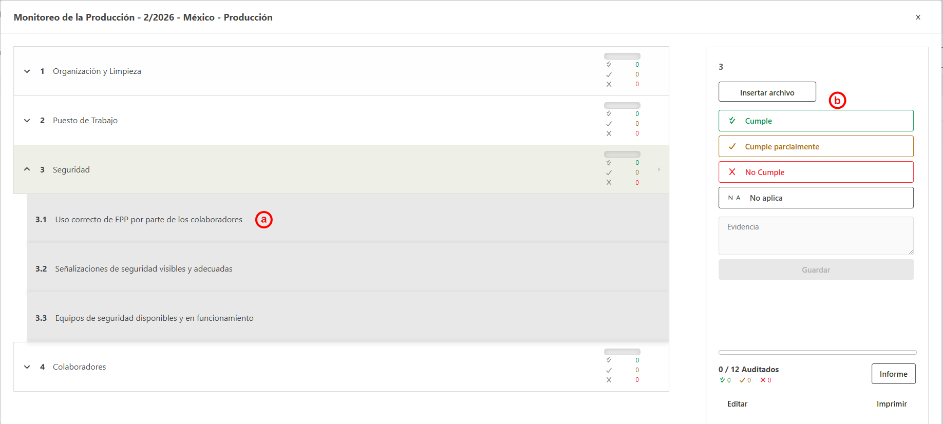 - En la ventana que se abre, realice la auditoria de todos los requisitos mostrados.