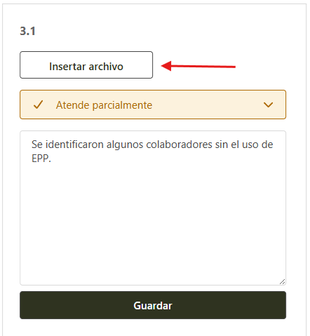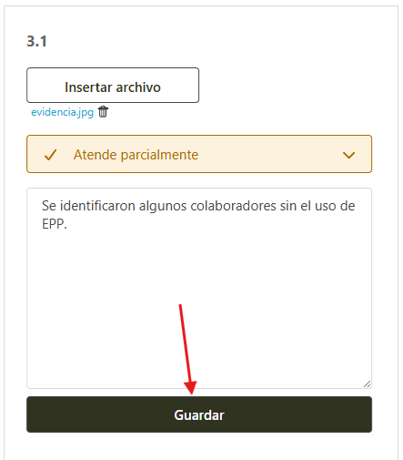 Al seleccionar los ítem Atiende parcialmente, No atiende o No se aplica, el sistema va a solicitar que se ingrese una evidencia de forma obligatoria para justificar dicha la selección.