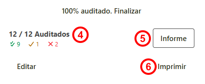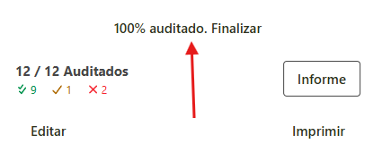 Si no se ha comenzado a completar la lista de control, puede imprimir la misma para completarla en papel y posteriormente ingresarla en el sistema. - Al finalizar la evaluación de todos os ítem de la auditoria, hacer clic en el botón que aparece como 100% auditado. Finalizar