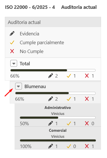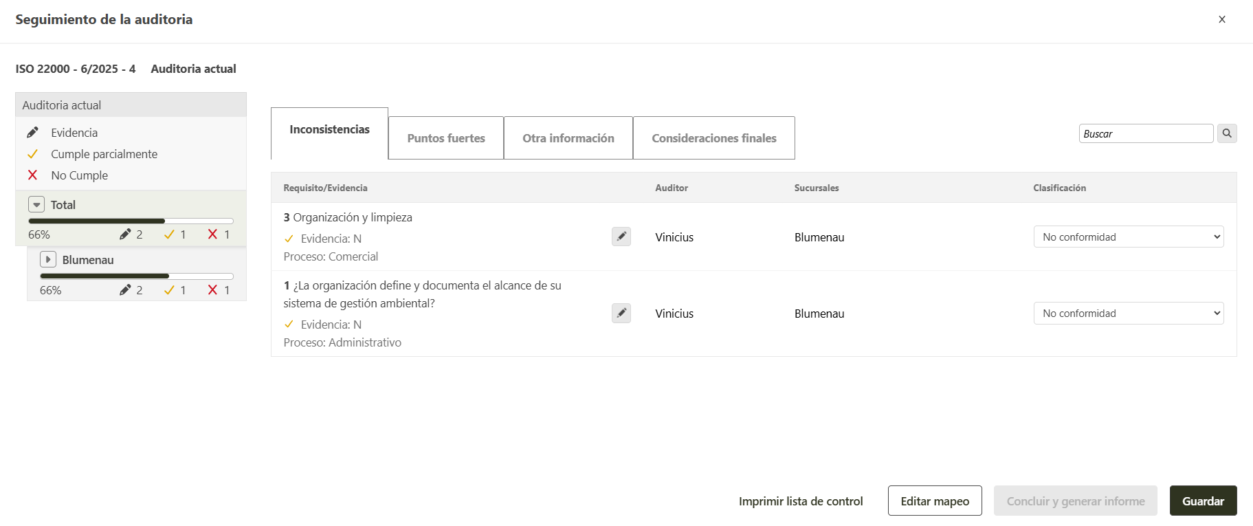 Cuando la lista de control de todos los procesos auditados esté completa en el 100%, podrá finalizar el informe de la auditoria, haga clic en Concluir y generar informe, como se explica ese artículo. Si este botón no aparece, lea este artículo.