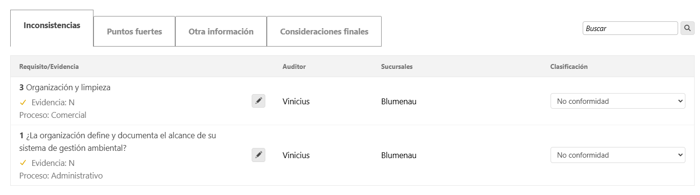En la pestaña Inconsistencias, se muestran las inconsistencias encontradas en la auditoria, con el número de su requisito, evidencia y estado: Atiende parcialmente