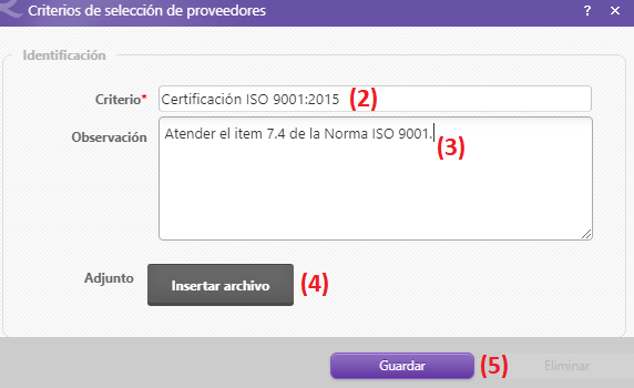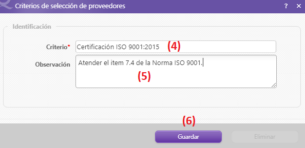 - En el campo Criterio describa el requisito para selecionar un proveedor. Ejemplo.: Certificación ISO 9001:2015