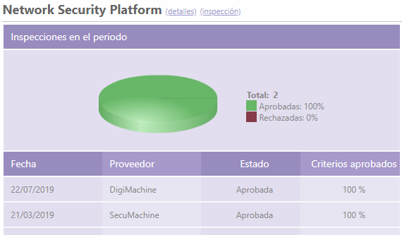 - Despues de este encabezado se muestra el gráfico de Inspecciones en el periodo seleccionado. Este gráfico resume todas las inspecciones realizadas con relación al producto o servicio consultado. De acuerdo al ejemplo de abajo, para el producto Network Security Platform fueron realizadas 2 inspecciones de las cuales se aprobaron el 100%. Por defecto el sistema muestra solamente 5 inspecciones, para listar el resto puede hacer clic en el botón al final Mostrar más.