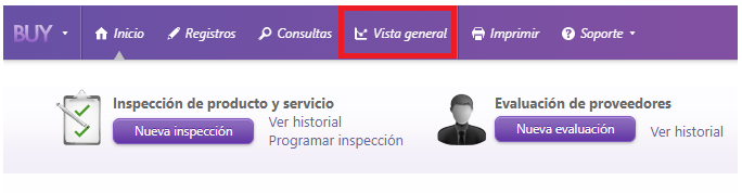 La ventana de vista general sirve para visualizar el desempeño de los proveedores a partir del resultado de las evaluaciones e inspecciones, así como acompañar las inspecciones de productos/servicios proveídos a su empresa.