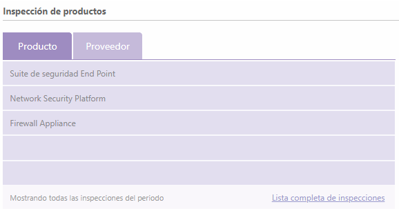 En el primer panel, en la pestaña de Producto, se relacionan los últimos productos/servicios inspeccionados. En la pestaña Proveedor se muestran los últimos proveedores con productos inspeccionados, en el periodo indicado.