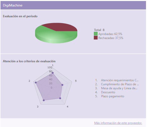 Si hace clic en uno de los proveedores listados en el cuadro de evaluaciones, en el gráfico se mostrará la información referente a la cantidad de evaluaciones de ese proveedor y en la parte de abajo aparece un gráfico de radar que representa el cumplimiento de los criterios de evaluación en porcentajes relativos al atendimiento de los criterios de las evaluaciones realizadas.