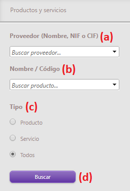 - Proveedor (Nombre, NIF o CIF): En este campo puede buscar los productos/servicios que son brindados por el proveedor seleccionado, digitando el nombre NIF o CIF del proveedor, o haciendo clic en la flecha de lado para abrir la lista de proveedores registrados en el sistema. Si existe algun producto/servicio relacionado al proveedor elegido en el campo entonces sera mostrado en el resultado de la consulta.