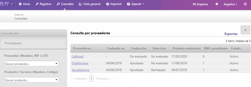 La pestaña de Consultas es la herramienta de búsqueda de BUY, que permite la rápida localización y acceso a todos los datos de la organización que ya se han ingresado en el sistema. Permite la búsqueda personalizada de: proveedores, no conformidades, inspecciones, entre otros, a través de filtros específicos para cada tipo de búsqueda, proporcionando así una consulta más específica. Para consultar por proveedor, siga los pasos a continuación: