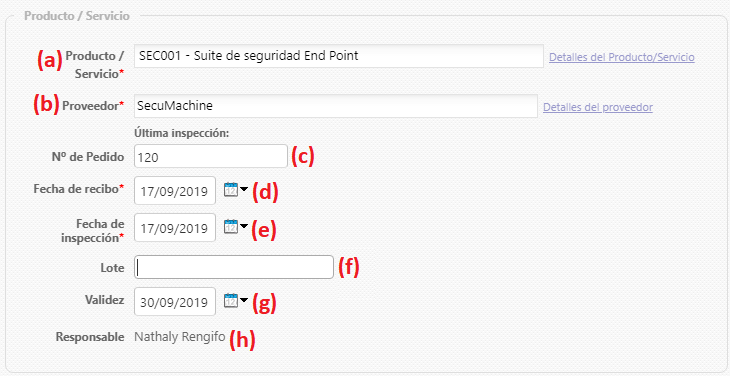 En la sección Producto / Servicio se muestra la información especifica de la inspección como se describe a continuación:
