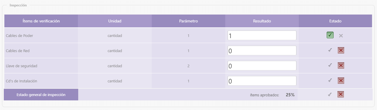 En la sección de Inspección, se muestran los ítem o criterios evaluados en la inspección con sus respectivos resultados, así como el estado final de la inspección, que en el siguiente ejemplo fue reprobada.