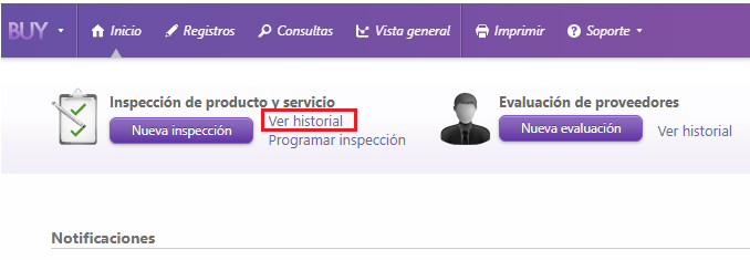 - Para visualizar el historial de inspecciones de un producto/servicio por la ventana de inicio de BUY, hacer clic en el enlace Ver historial que está de lado del botón Nueva inspección, localizado en la parte superior izquierda.