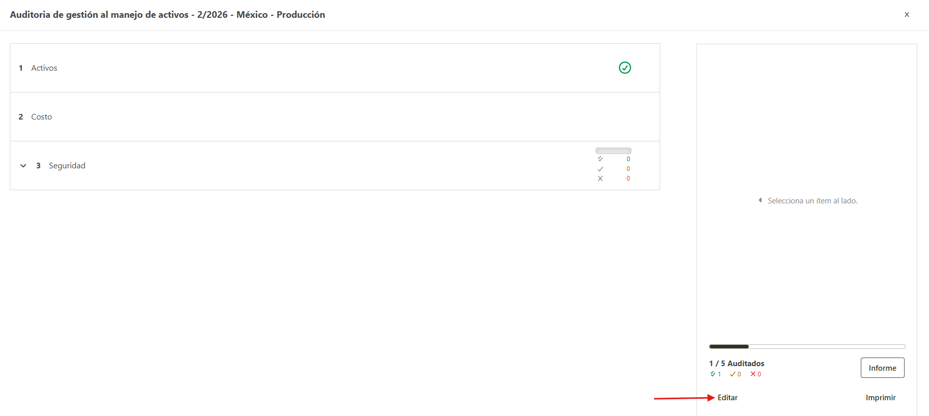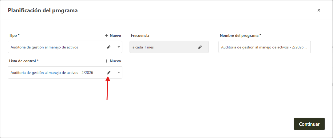 Siga los pasos como si estuviera registrando un nuevo programa de auditoria. Al seleccionar la lista de control, podrá editarla haciendo clic en el lápiz situado a la derecha del campo, según muestra la siguiente imagen: