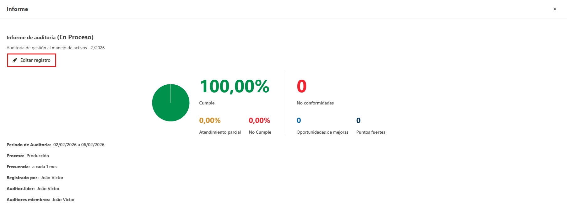 El responsable por el registro de la auditoria, debe ingresar a la misma por medio de la ventana de consulta y hacer clic en Editar registro.