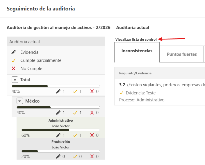 - Hacer clic sobre el pendiente de Seguimiento de auditoria y seleccionar el proceso donde modificará la lista de control.