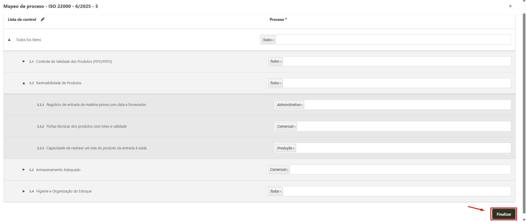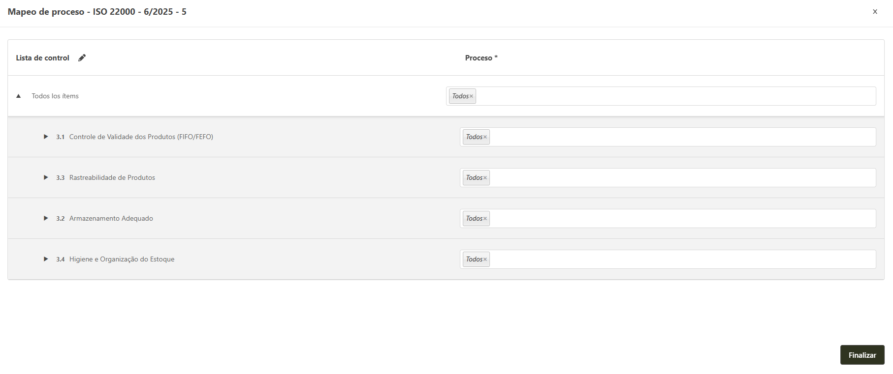 En el pendiente de Mapeo de proceso, el usuario define si cada ítem se aplica a todos los procesos, solamente a un proceso o a mas de un proceso para cada ítem o sub-ítem.