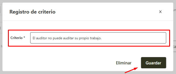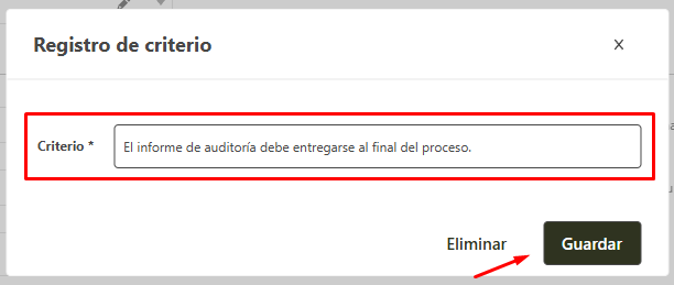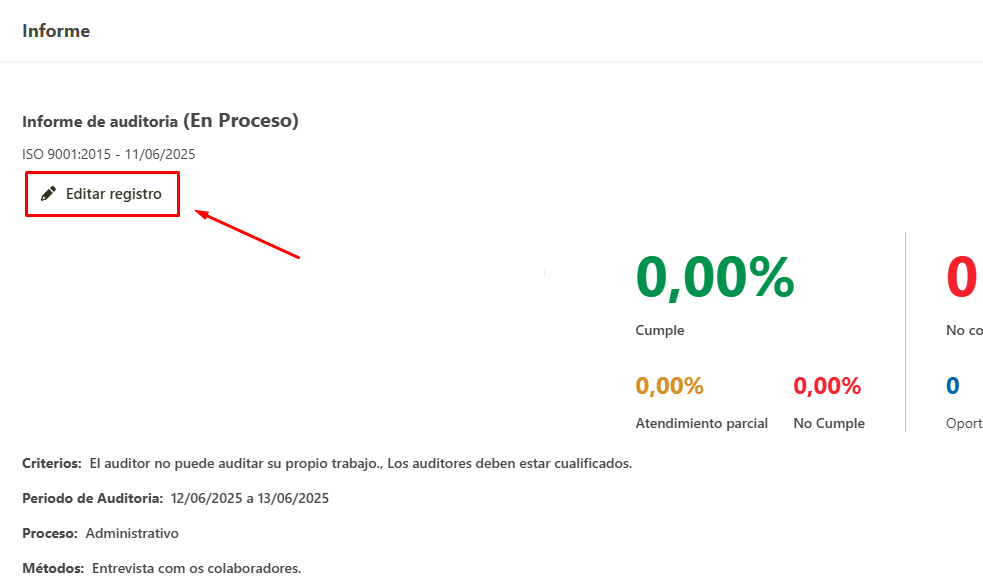Para editar los criterios y métodos por medio de la ventana de edición de auditoria, siga los pasos a continuación. Recuerde que solamente el responsable por el registro de la auditoria puede ingresar a la ventana de registro y editar.