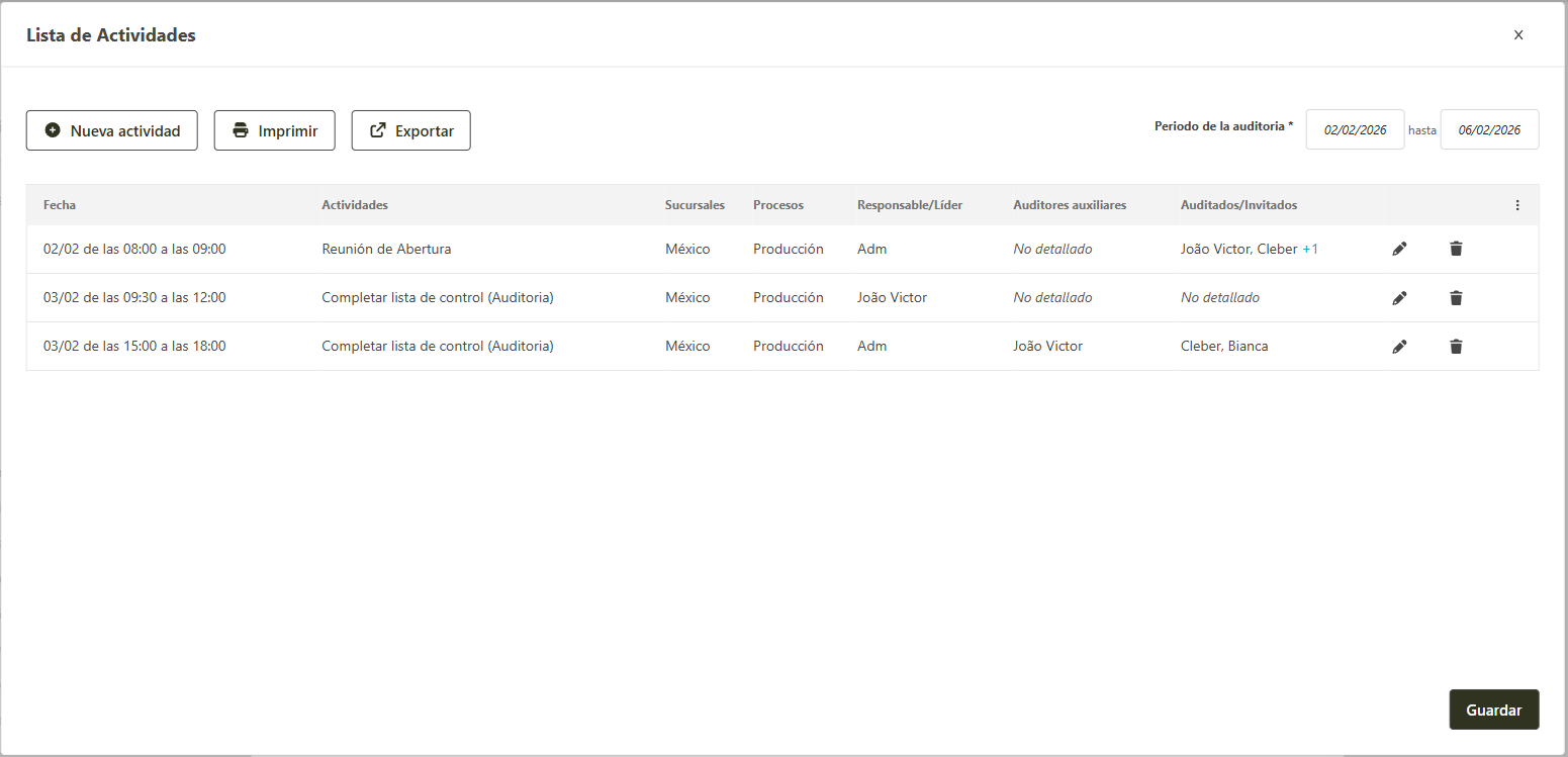 La impresión de la lista de actividades permite enviar esta información para un tercero o para ingresarlo en un cuadro de gestión por ejemplo para informar a todos el período que se va a llevar a cabo la auditoria.