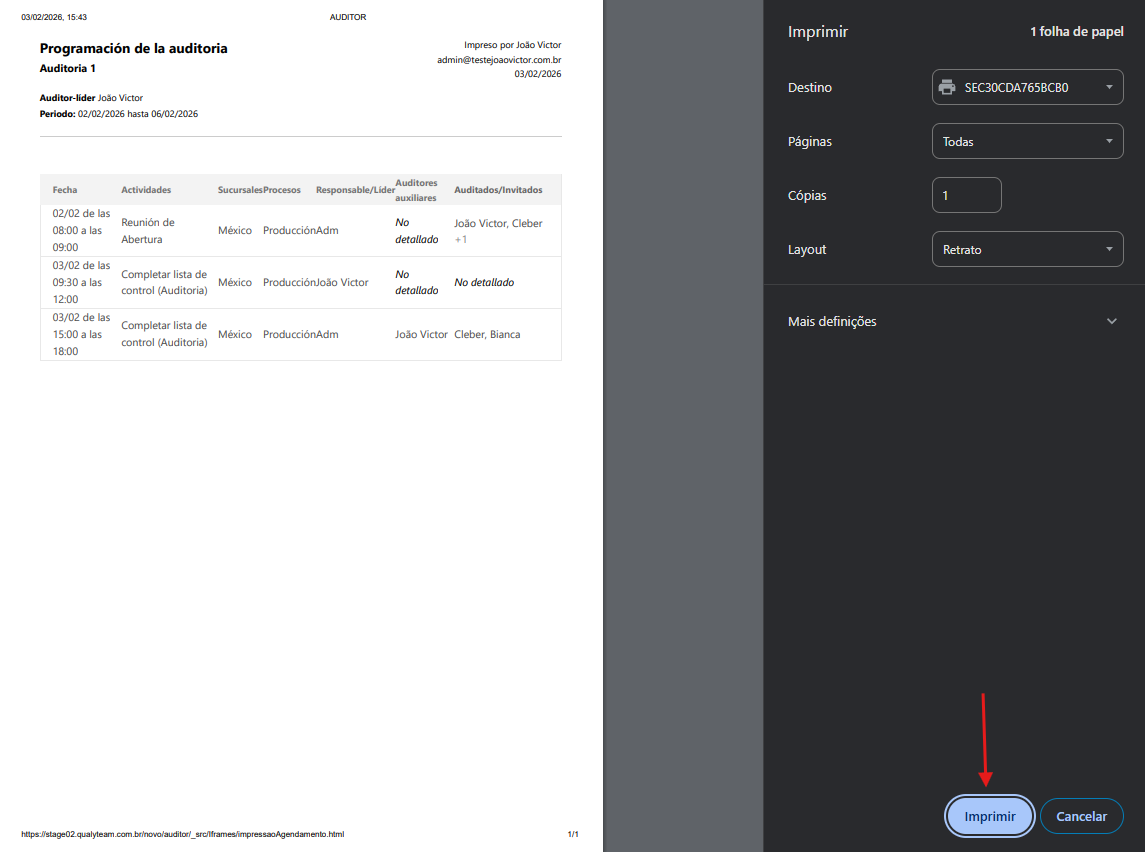 Para imprimir por medio de la ventana de edición de la auditoria, siga los pasos a continuación, recuerde que solamente el responsable por el registro de la auditoria puede imprimir y ademas la auditoria debe estar en ejecución.