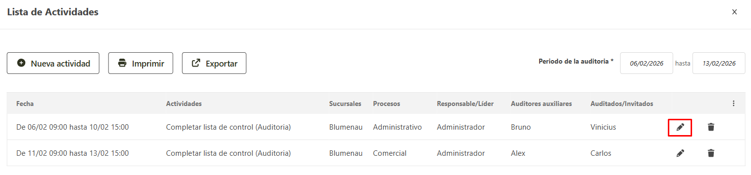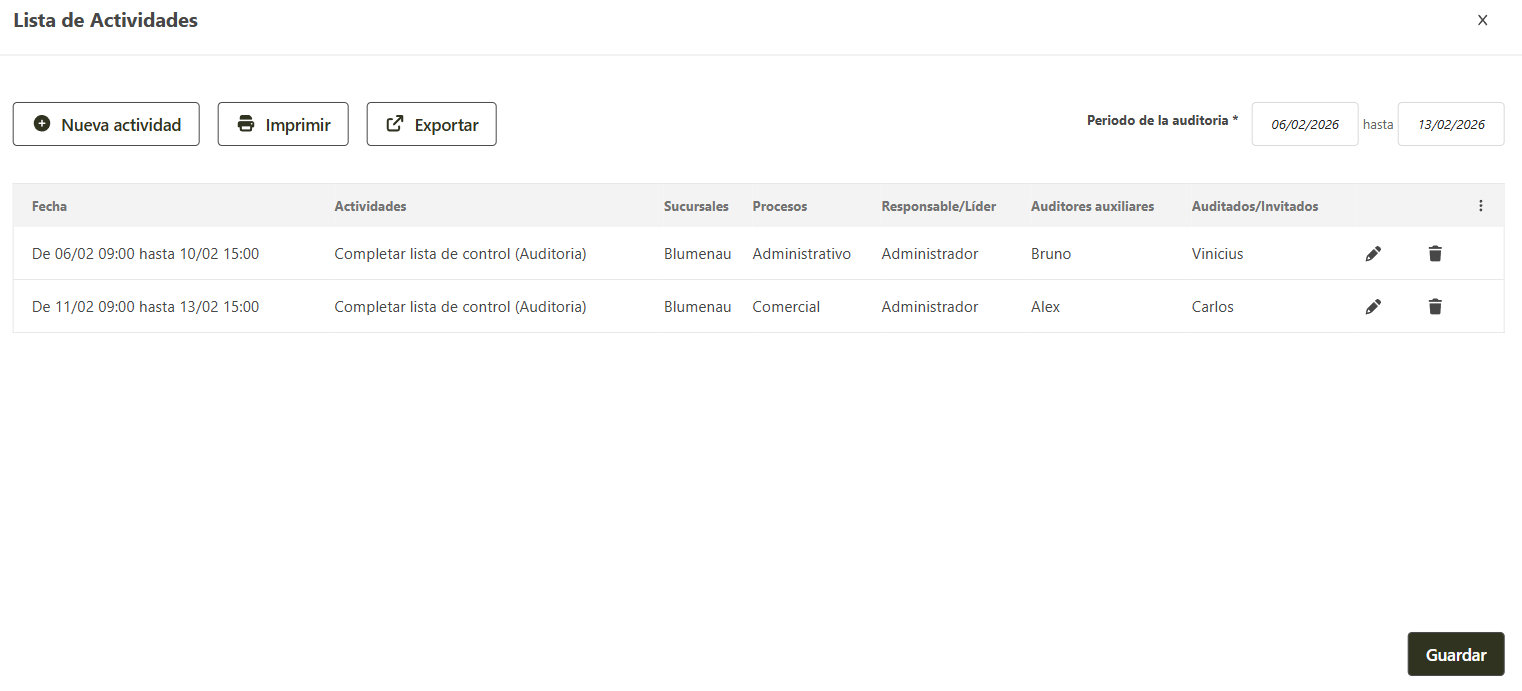 - En la ventana de la lista de actividades se muestran todas as actividades registradas para el programa de auditora.