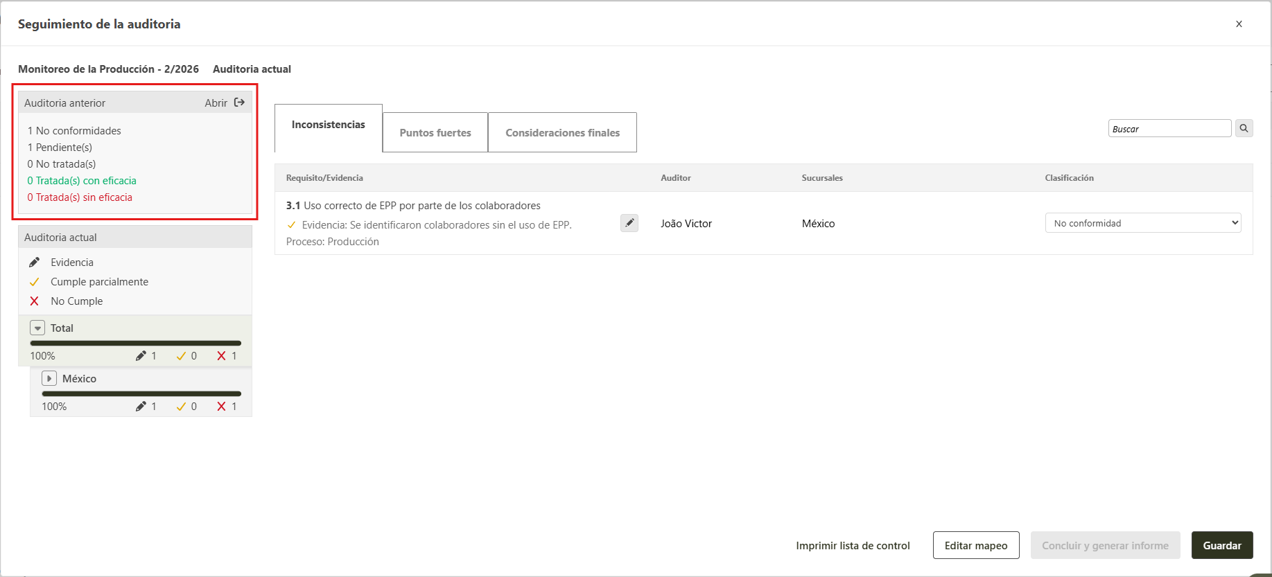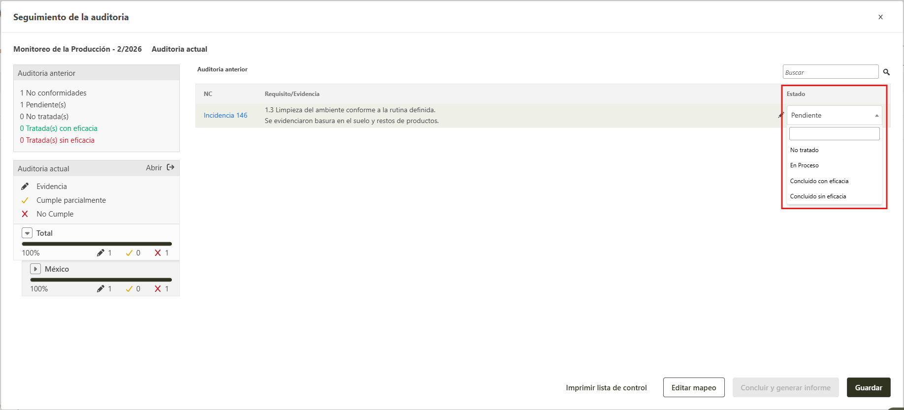 El responsable por hacer seguimiento a la auditoria, solo podrá finalizarla cuando todos los procesos estén auditados o si todas las no conformidades de la auditoria anterior fueron evaluadas. La opción para tratar las NCs de auditorias apuntadas anteriormente, estará disponible si en el momento del registro fue marcada la opción Evaluar tratamiento dado a las no conformidades de los programas anteriores, como se explica en este enlace.