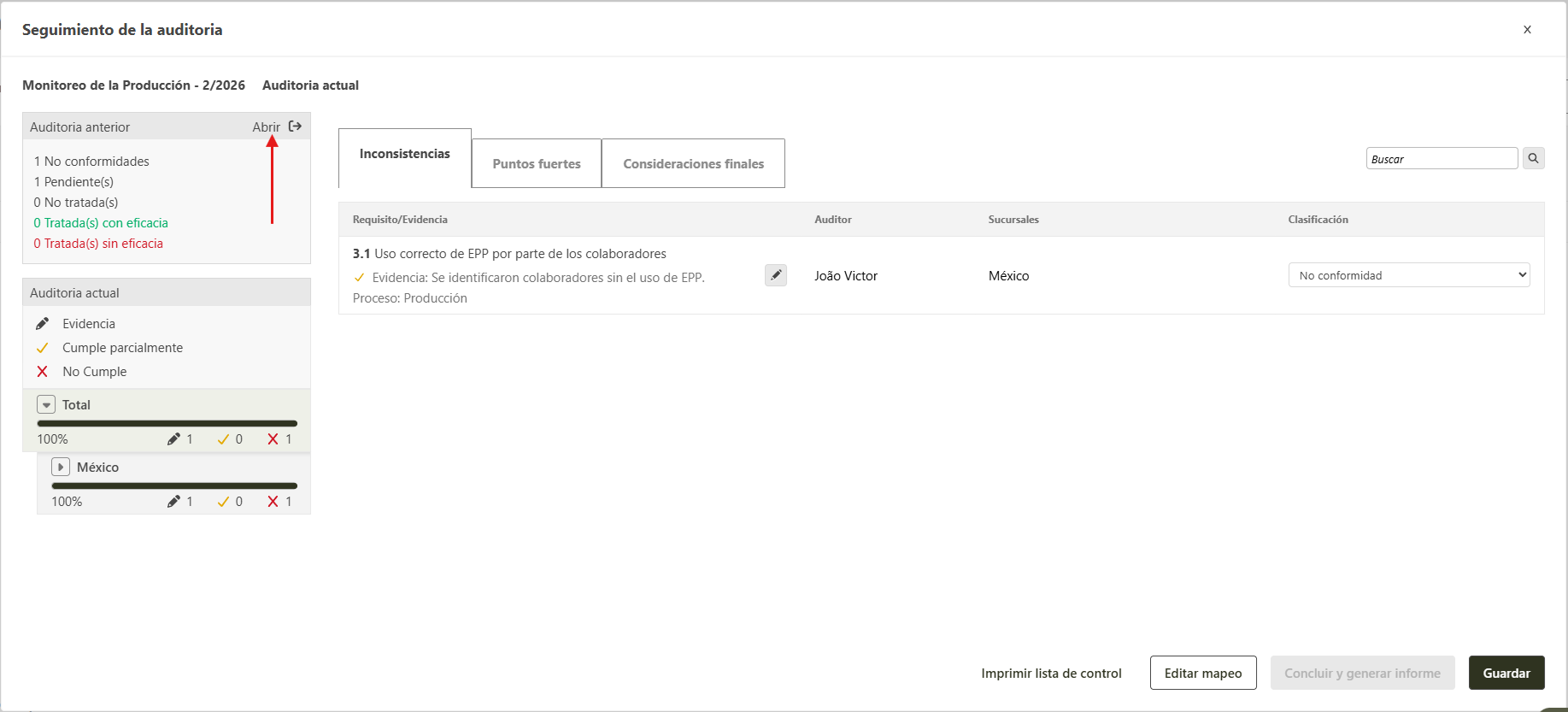 - Al hacer clic en el botón abrir, el sistema mostrará la lista de todas las no conformidades apuntadas en la auditoria anterior.