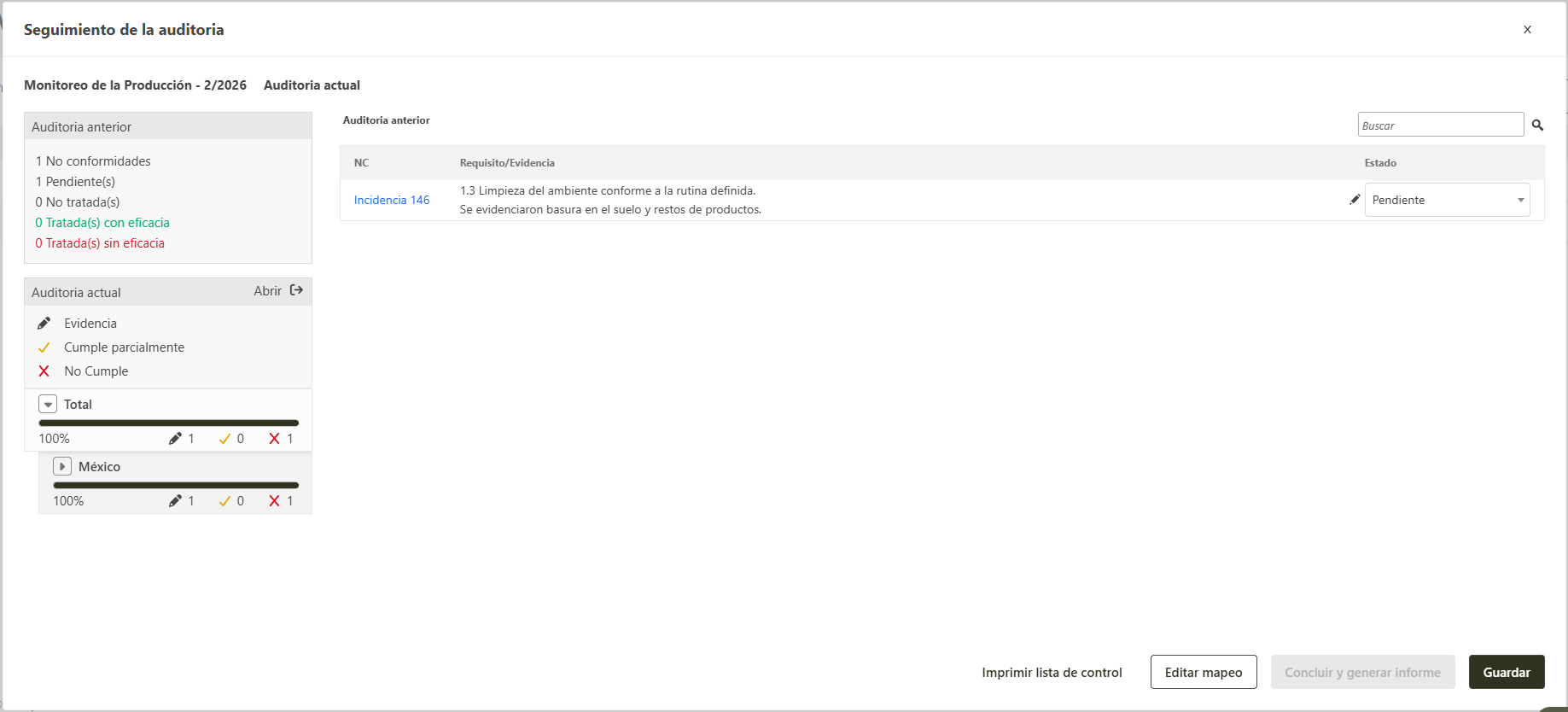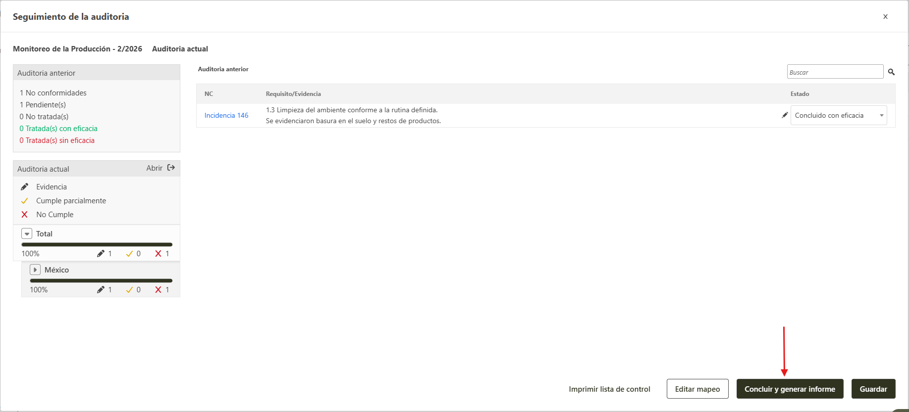 - Al finalizar la evaluación de las no conformidades anteriores, automáticamente el sistema habilitará el botón Concluir y generar informe. Así su auditoria puede ser finalizada y podrá consultar el resultado en la ventana de consultas.