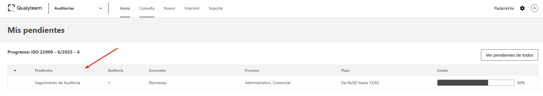 - En la ventana de inicio, localice el pendiente de seguimiento de la auditoria.