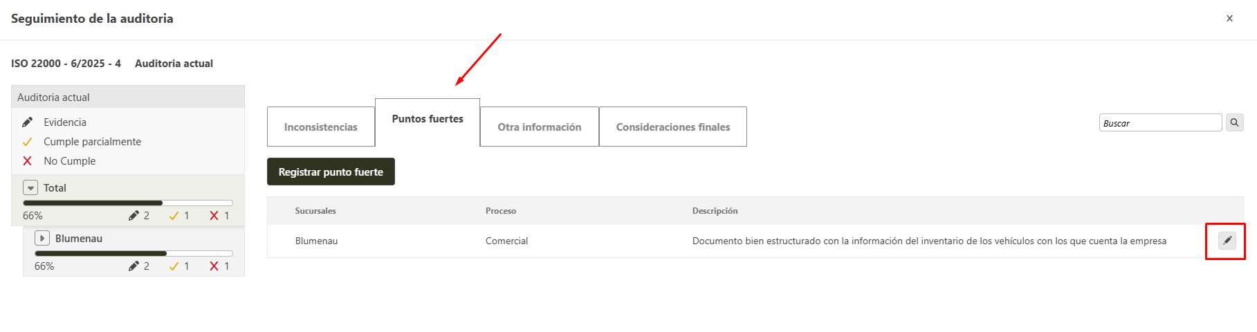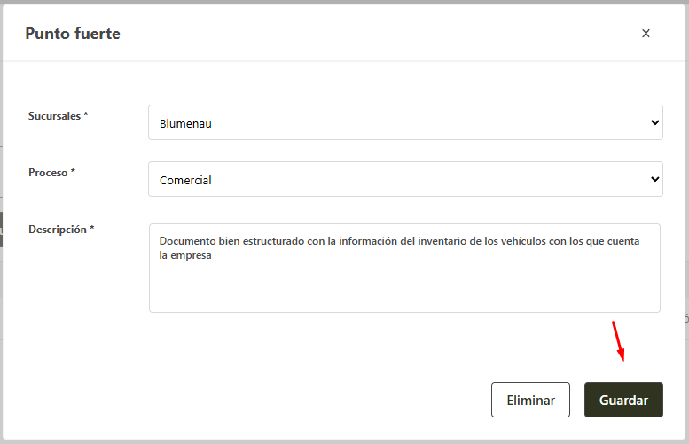 - Al finalizar la edición, el sistema retorna para la pestaña de puntos fuertes.