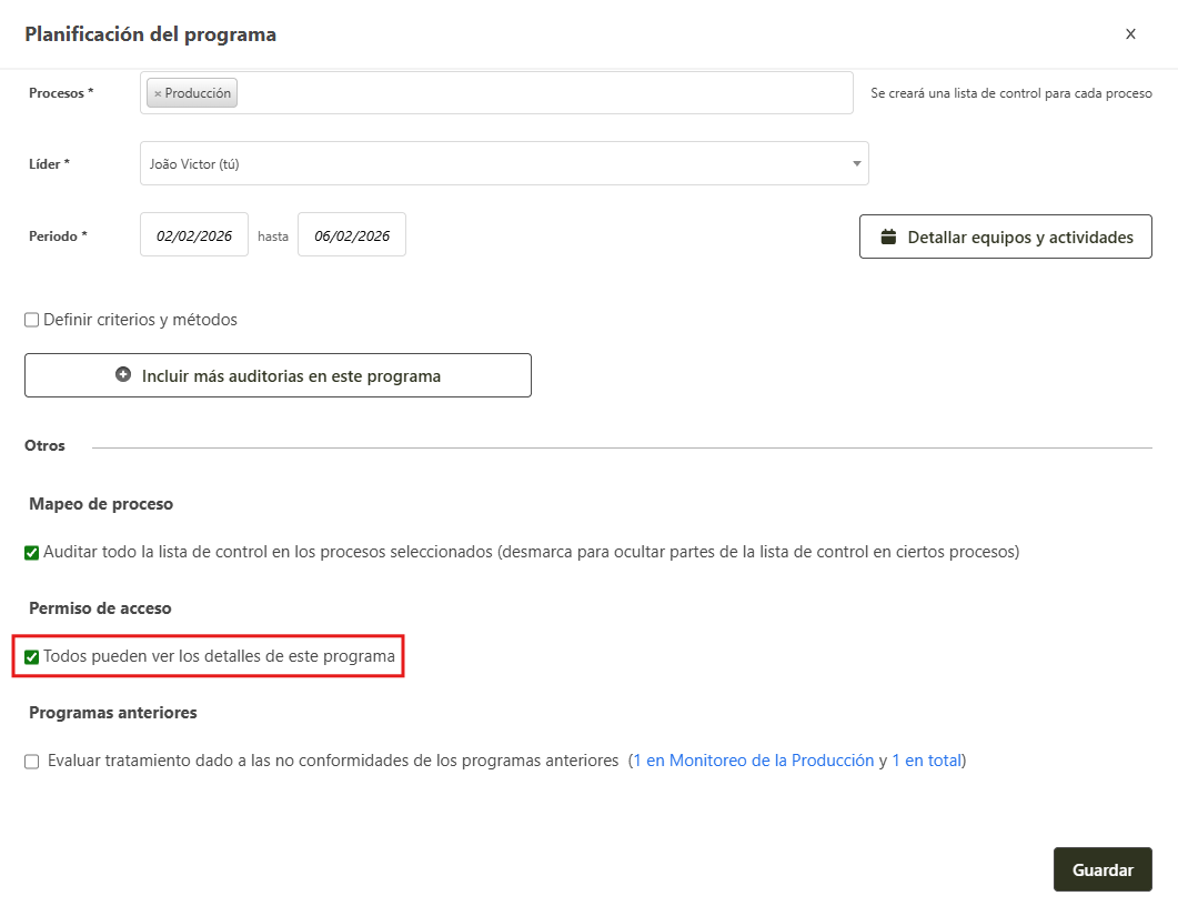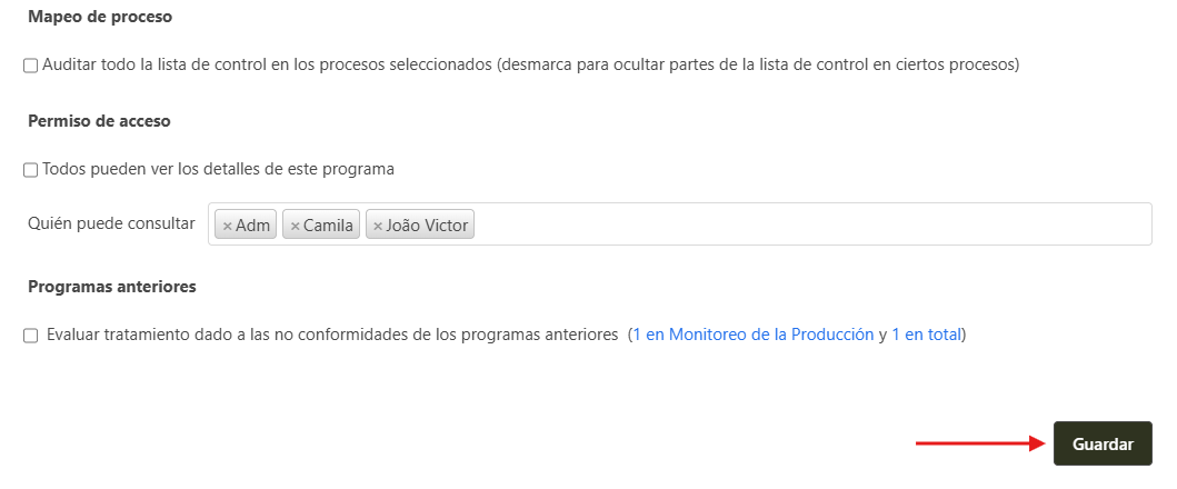 - Si el registro de nuevo programa de auditoria está listo, haga clic en Guardar para salvar los datos.