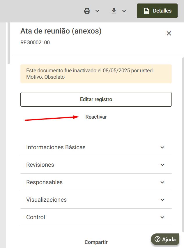 En los detalles del documento se mostrarán las informaciones relacionadas con la reactivación del documento, la fecha de la reactivación, el usuario que lo reactivó y el motivo de la reactivación.