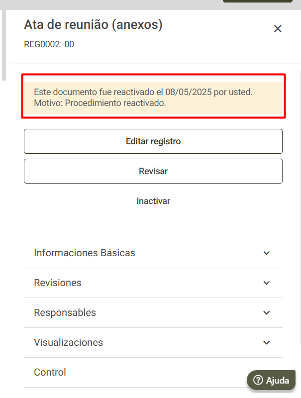 El sistema permite que un documento inactivado anteriormente pueda ser reactivado, sin embargo, solamente el usuario elaborador podrá realizar esa acción. Siga los pasos abajo para reactivar un documento: