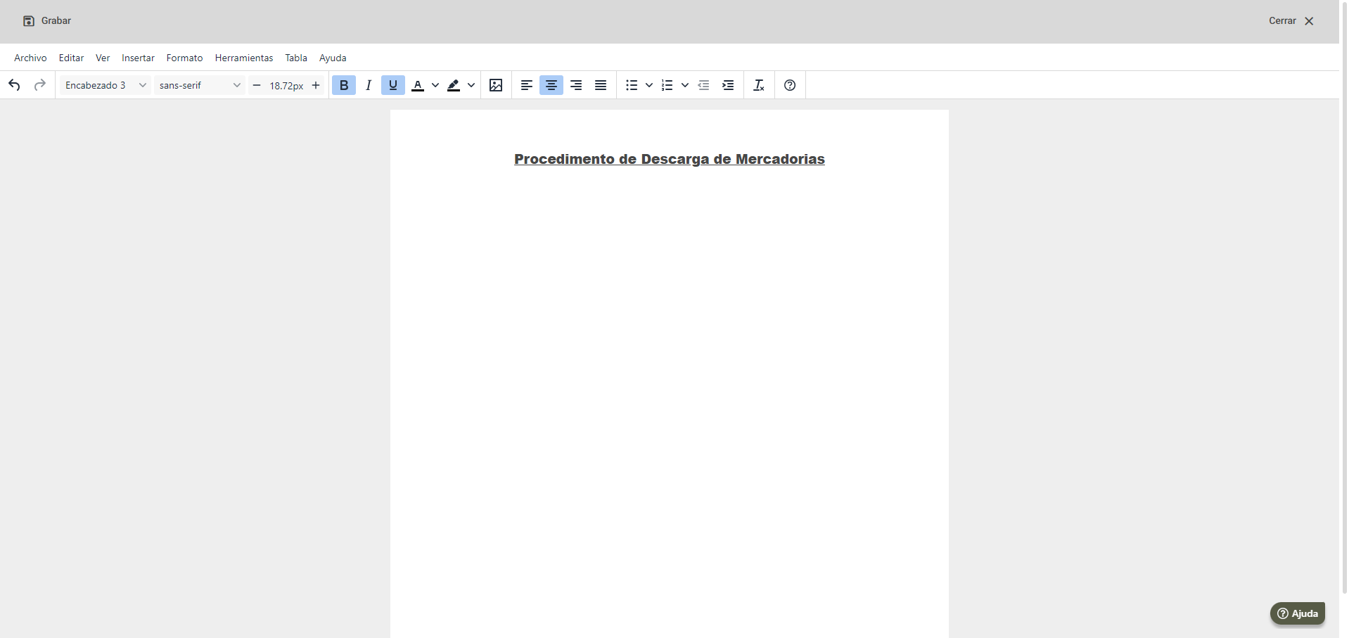 En esta pantalla de creación del documento, se listarán algunas opciones como formato estándar del editor, conforme se detalla a continuación: