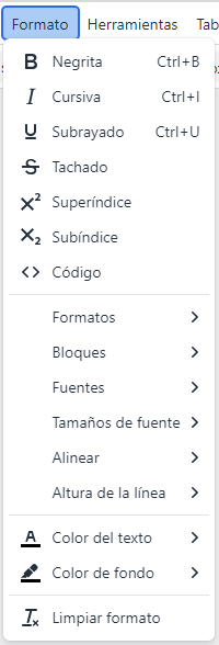 - Formato - permite configurar la apariencia del texto, como: