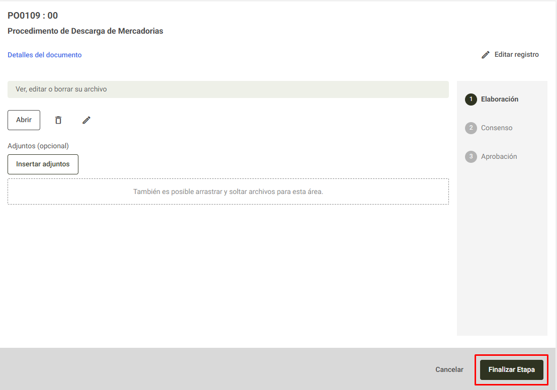 En la etapa de elaboración de un documento es posible insertar un archivo ya elaborado o crear uno directamente dentro del sistema.