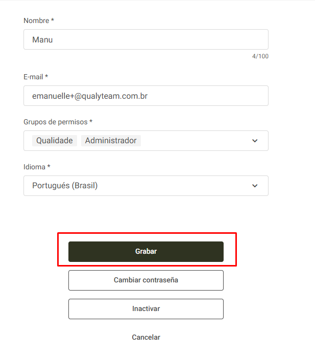 - Al abrir la pantalla de registro del usuario, realice los cambios necesarios en los campos y haga clic en Grabar.