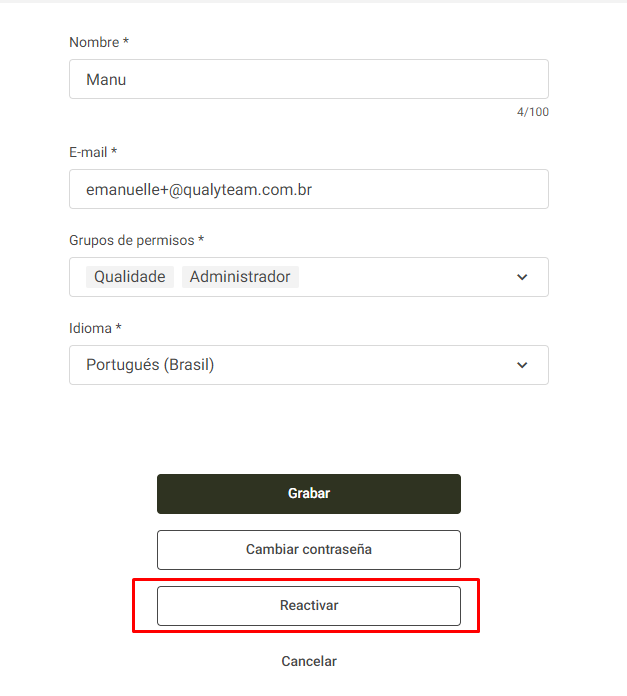 - Al abrir la pantalla de registro del usuario, verifique los datos existentes, asegurándose de que ha seleccionado al usuario correcto. Haga clic en la opción Reactivar.