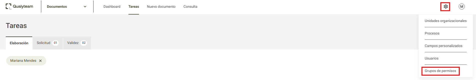 Para eliminar un grupo de permisos, acceda al menú de configuración haciendo clic en el ícono de engranaje. A continuación, seleccione Grupos de permisos: