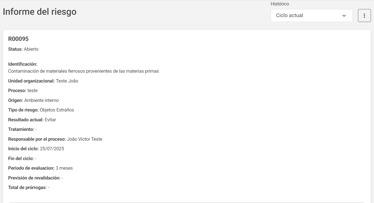 En el lado derecho, en Histórico, se encuentra el registro de todos los ciclos y reevaluaciones realizadas en el riesgo a lo largo del tiempo.