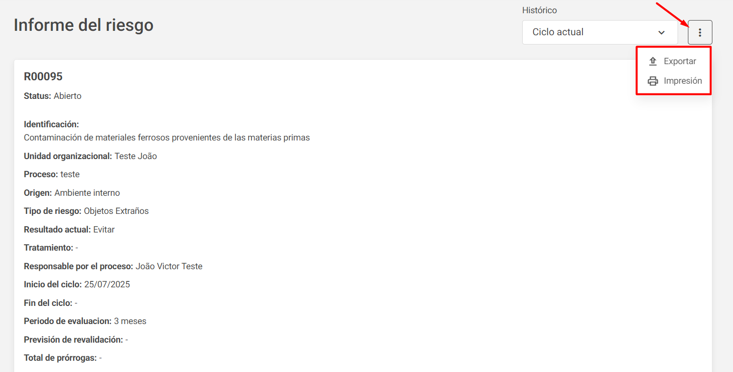 Al lado del historial, al hacer clic en el ícono de tres puntos, será posible imprimir o exportar el informe de riesgo.