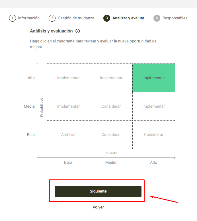 Para realizar la evaluación, simplemente haga clic en el cuadrante correspondiente a su análisis, considerando el Impacto y la Probabilidad de su oportunidad, y luego haga clic en "Siguiente" para continuar con la siguiente etapa: