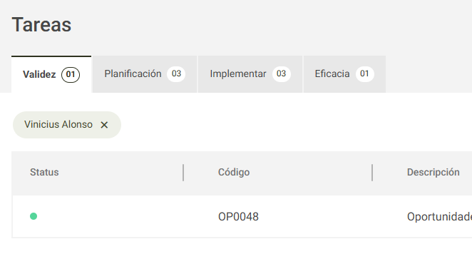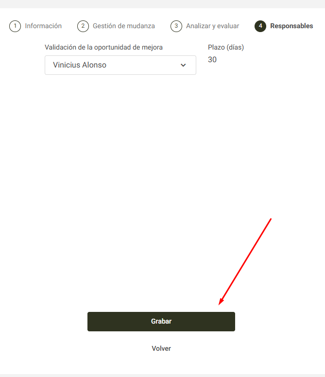 Después de completar la pantalla de analizar y enviar, basta con seleccionar al usuario responsable por la Validación de la Oportunidad de Mejora y Guardar el registro de la Oportunidad de Mejora: