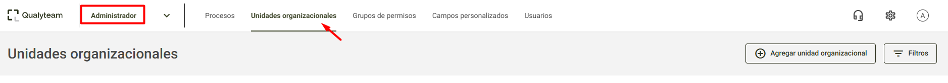 Para eliminar una Unidad Organizacional, acceda al Menú Administrador o al ícono de engranaje y, a continuación, haga clic en Unidades Organizacionales: