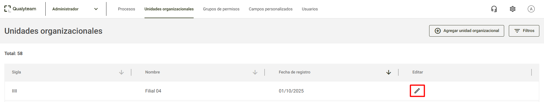 Localice la Unidad que desea eliminar y haga clic en el ícono de lápiz: